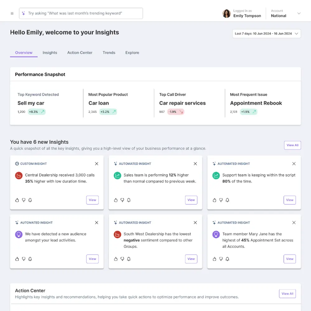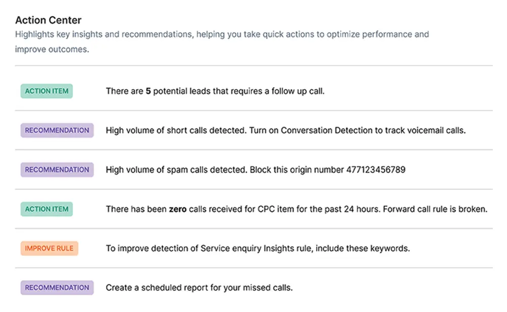 The AI-powered Action Center serves as your command center for performance optimization. It analyzes patterns across all calls and provides specific, actionable recommendations for improvement. Think of it as your AI-powered business consultant, continuously monitoring your operations and suggesting ways to enhance performance.